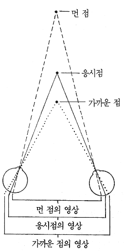 ±×¸² 5.1 Àº ¾ç¾È½Ã Â÷À̸¦ º¸¿©ÁØ´Ù. µÎ ´«ÀÌ ÀÀ½ÃÇÑ Á¡ÀÌ ¹«¾ùÀÌ°Ç °£¿¡ ±× ¿µ»óÀº °¢ ¸Á¸·ÀÇ Á߽ɺÎ, Áï ¼ö¿ë±âµéÀÇ ¹Ðµµ°¡ °¡Àå ¹ÐÁ¢ÇÑ °÷¿¡ ¸ÎÈù´Ù. µÎ ´«¿¡ º¸ÀÌ´Â ´Ù¸¥ ¾î¶² Á¡ ¿ª½Ã ¾ç ´«ÀÇ ¸Á¸·¿¡ Åõ»çµÉ °ÍÀ̸ç, ±×¸²ÀÌ º¸¿©ÁÖµíÀÌ, ±×°ÍÀÌ µÎ ´« °¢°¢ÀÇ Á߽ɿ¡¼ ¶³¾îÁø °Å¸®¿Í ¹æÇâÀº ÀÀ½ÃÁ¡°ú °ü·ÃµÈ °ø°£Àû À§Ä¡¿¡ ÀÇÇØ¼¸¸ °áÁ¤µÈ´Ù. ¿¹¸¦ µé¾î °¡±î¿î Á¡Àº µÎ ´«ÀÇ ¸Á¸·ÀÇ Á߽ɿ¡¼ ¾à°£ ¶³¾îÁø °÷¿¡ Åõ»çµÇÁö¸¸, µÎ ´«ÀÇ °üÁ¡ÀÌ ´Ù¸£±â ¶§¹®¿¡ °Å¸®³ª ¹æÇâÀº ´«¸¶´Ù ´Ù¸£´Ù. ¾ç¾È½Ã Â÷ÀÌÀÇ Å©±â¿Í ¹æÇâÀÌ ¾Ë·ÁÁö¸é, »ï°¢¹ý (trigonometry) À¸·Î ±× Á¡¿¡ ´ëÇÑ »ó´ëÀûÀÎ ±íÀ̸¦ Æ÷ÂøÇÒ ¼ö ÀÖ´Ù.