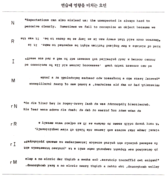 콜러스 (Kolers, 1979) 는 그림 3 과 같은 재료를 사용하여 읽기 기술이 획득되는 과정을 연구했다. 첫 번째 덩이글 (text) 유형은 정상이지만 (N), 다른 것들은 다양하게 변형 되었다. R 형에서는 줄 전체가 상하 좌우로 역전되었고, Ⅰ형에서는 각 낱자가 상하로, M형에서는 줄 전체가 거울상을 만들면서 역전되었다. 너머지는 이 변형들의 조합이다. 한 연구에서, 콜러스는 역전된 덩이글 (I) 을 집중적으로 읽게 해서 그 연습 효과를 검토했다. 정상 덩이글 첫 페이지를 읽는 데 1.5 분이 걸린데 비해 역전된 덩이글에서는 16 분 이상이 걸렸다. 읽기 속도를 처음 측정한 후, 피험자들은 역전된 덩이글 200 페이지로 읽기 연습을 하였다. 그림 4 는 연습량에 따른 읽기 시간을 대수 척도로 보여 준다. 이 그림에서, 연습량은 읽은 페이지의 수로 측정된다. 연습에 따른 읽기 속도의 변화는 '역전된 덩이글로의 첫 훈련' 이라는 이름의 선분으로 나타나 있다. 콜러스는 중간중간 삽입된 정상 덩이글로도 읽기 속도를 측정했으며, 이 자료는 '정상 덩이글로의 첫 검사' 라는 이름의 선분으로 나타나 있다.