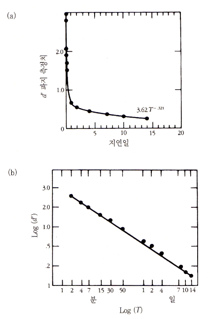 그림 1 (a) 지연기간 (T) 의 함수로서 d' 로 측정된 정확 단어 재인. (b) (a) 를 log - log 척도로 바꾼 자료. (Wickelgren. 1975.)
